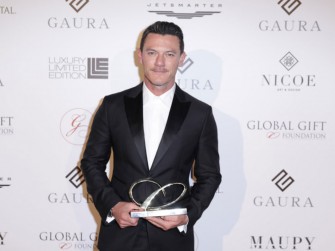 Maria Bravo presents the Global Gift Philanthropist Award to Hollywood actor Luke Evans during the Cannes film festival