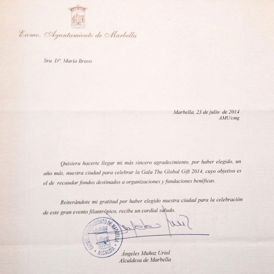 El Excelentísimo Ayuntamiento de Marbella a través de su Alcaldesa, Mª Ángeles Muñoz, reconoce durante la celebración de The Global Gift Gala, Marbella 2014, la trayectoria filantrópica ejercida los últimos años dentro y fuera de su país. La Alcaldesa hizo entrega de una placa conmemorativa en nombre de toda la ciudad y mostró su gratitud personal.