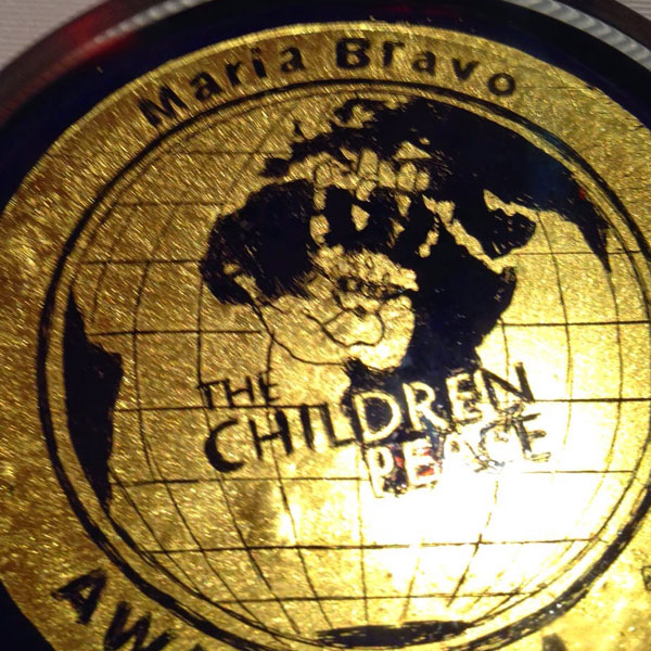 «The Children for Peace premia a María Bravo de la Fundación Global Gift por años de trabajo incansable y diligencia en favor de organizaciones sin fines de lucro, así como hombres, mujeres y niños que se han beneficiado directamente de su trabajo. Por Su humildad, su gentilidad, su visión y sus extraordinarios esfuerzos que la hacen más que merecedora de reconocimiento y es un honor conocerla y otorgarle esta pequeña muestra de reconocimiento.»