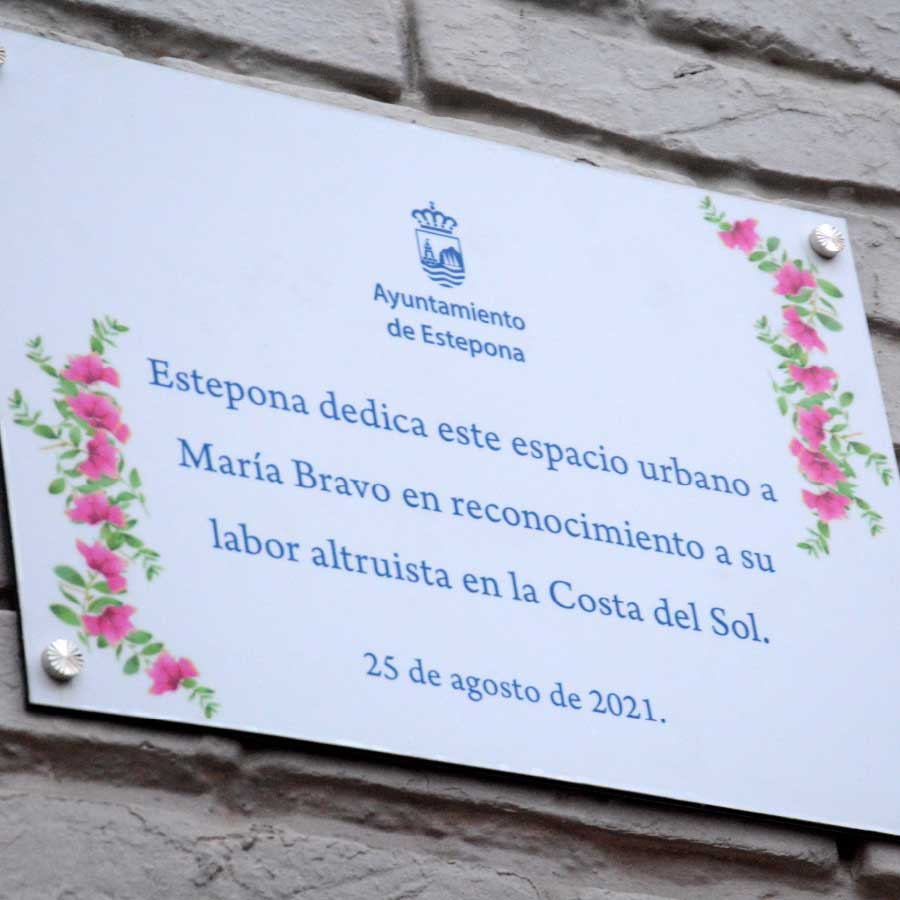 Con este reconocimiento se ha querido poner en valor la faceta solidaria de María Bravo y su vínculo con la Costa del Sol y, en concreto, con Estepona. María bravo en presencia del alcalde, José María García Urbano, reveló el rótulo de la calle en su honor “PLAZA MARIA BRAVO”.